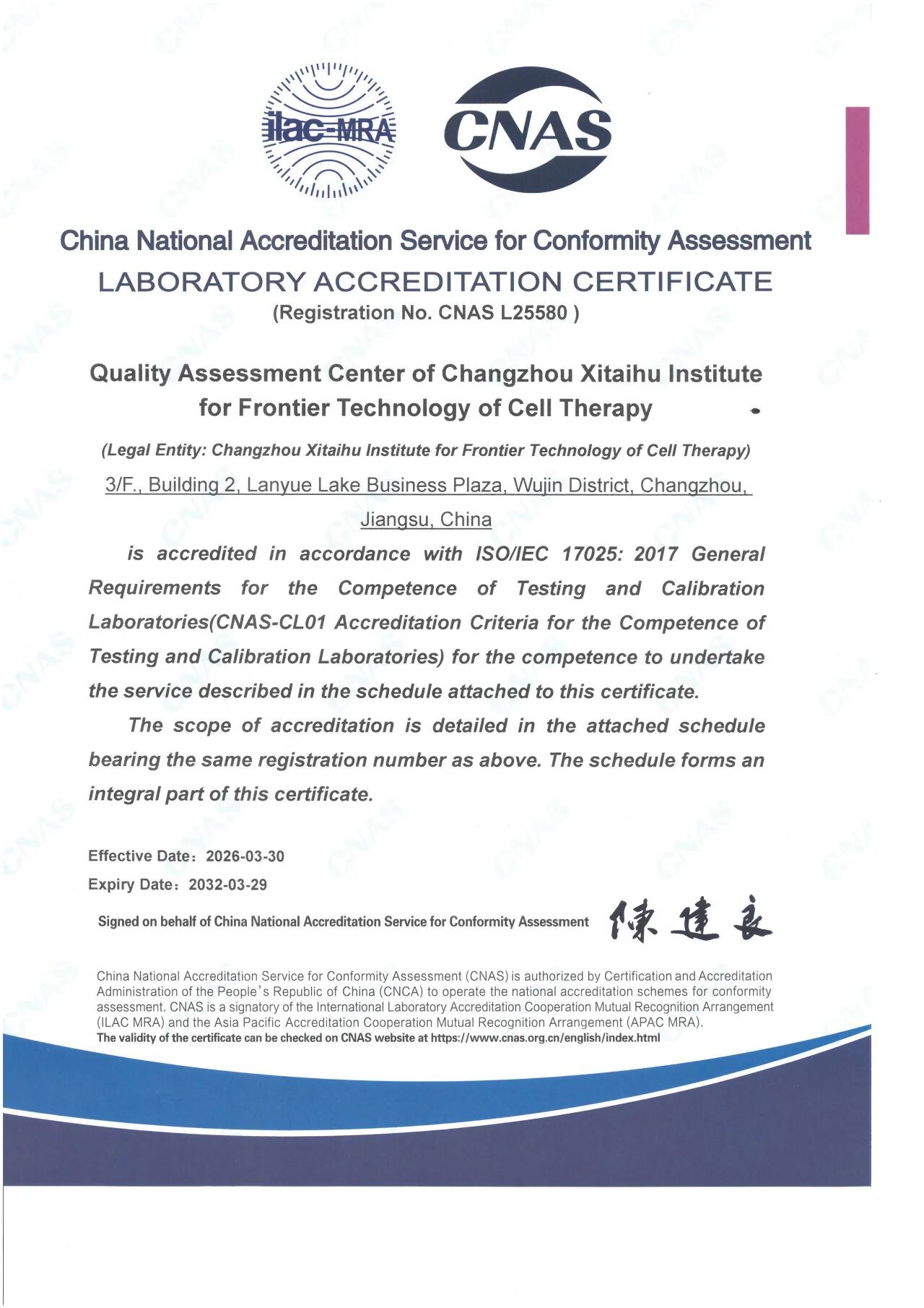 常州西太湖细胞治疗前沿技术研究院(以下简称"研究院")于2026年3月30日取得重要里程碑——其质量评价中心荣获中国合格评定国家认可委员会(CNAS)颁发的实验室认可证书(注册号:CNAS L25580)。这一成果标志着研究院的检测能力、质量管理体系和技术团队水平已达到国家权威认证标准,为研究院面向细胞治疗领域提供更加精准、高效、国际化的技术服务奠定了坚实基础。