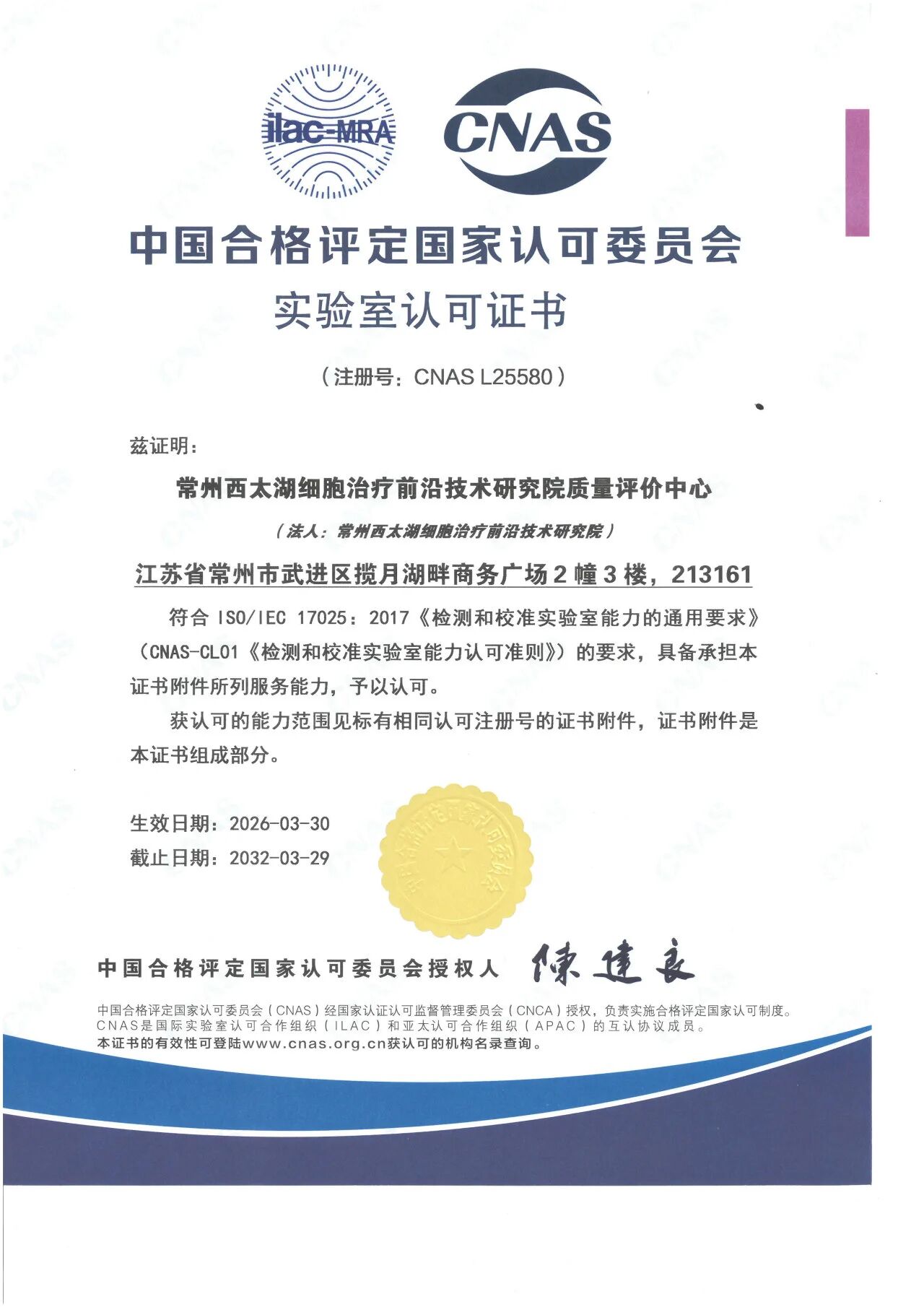 常州西太湖细胞治疗前沿技术研究院(以下简称"研究院")于2026年3月30日取得重要里程碑——其质量评价中心荣获中国合格评定国家认可委员会(CNAS)颁发的实验室认可证书(注册号:CNAS L25580)。这一成果标志着研究院的检测能力、质量管理体系和技术团队水平已达到国家权威认证标准,为研究院面向细胞治疗领域提供更加精准、高效、国际化的技术服务奠定了坚实基础。